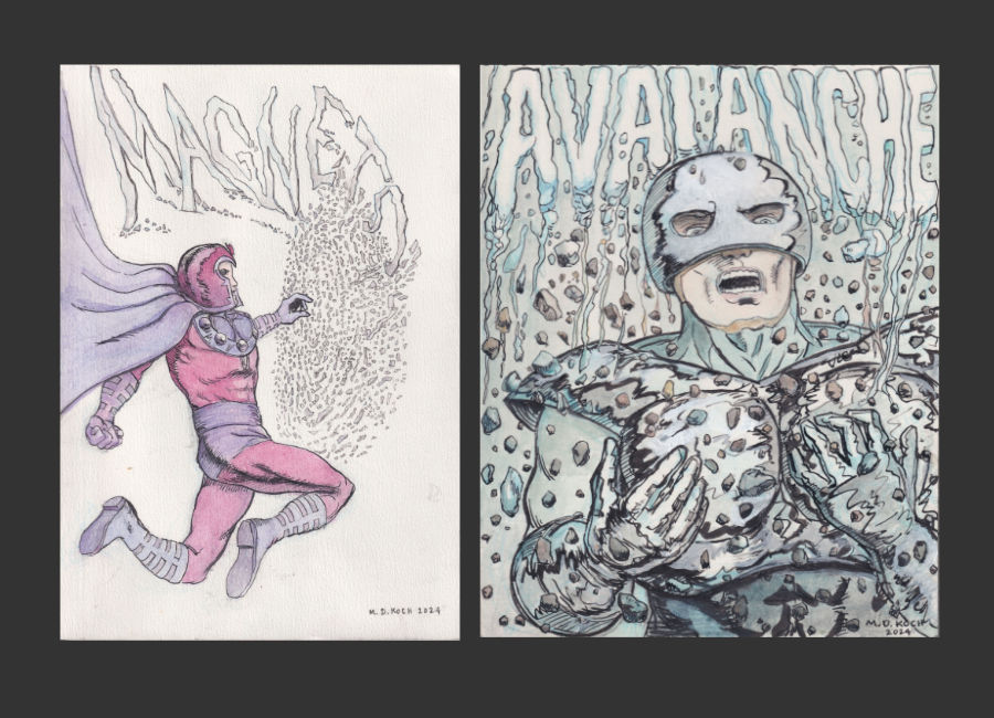 Marvel Folio | Marvel Pinups Art for Comic Art Live – “Magneto” / Avalanche”, ink, watercolor+gouache on watercolor paper (Nov 2024)