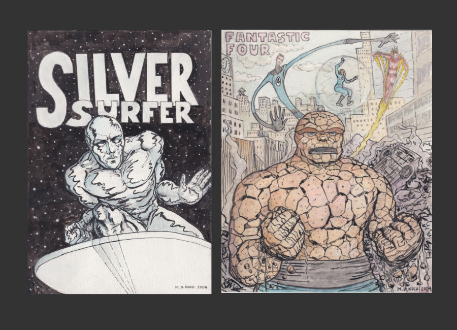Marvel Folio | Marvel Pinups Art for Comic Art Live- “Silver Surfer” / “Fantastic Four”, ink, watercolor+gouache on watercolor paper (Nov 2024)